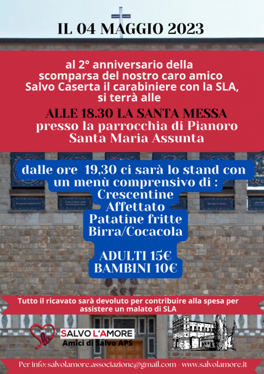 4 Maggio 2023 2° Anniversario di Salvo Caserta Anniversario della scomparsa di Salvo Caserta, il carabiniere con la SLA, si terrà il 4 Maggio 2023 alle 18.30 la Santa Messa presso la Parrocchia di Pianoro, “Santa Maria Assunta”. Dalle 19.30 ci sarà lo stand con un menù comprensivo...